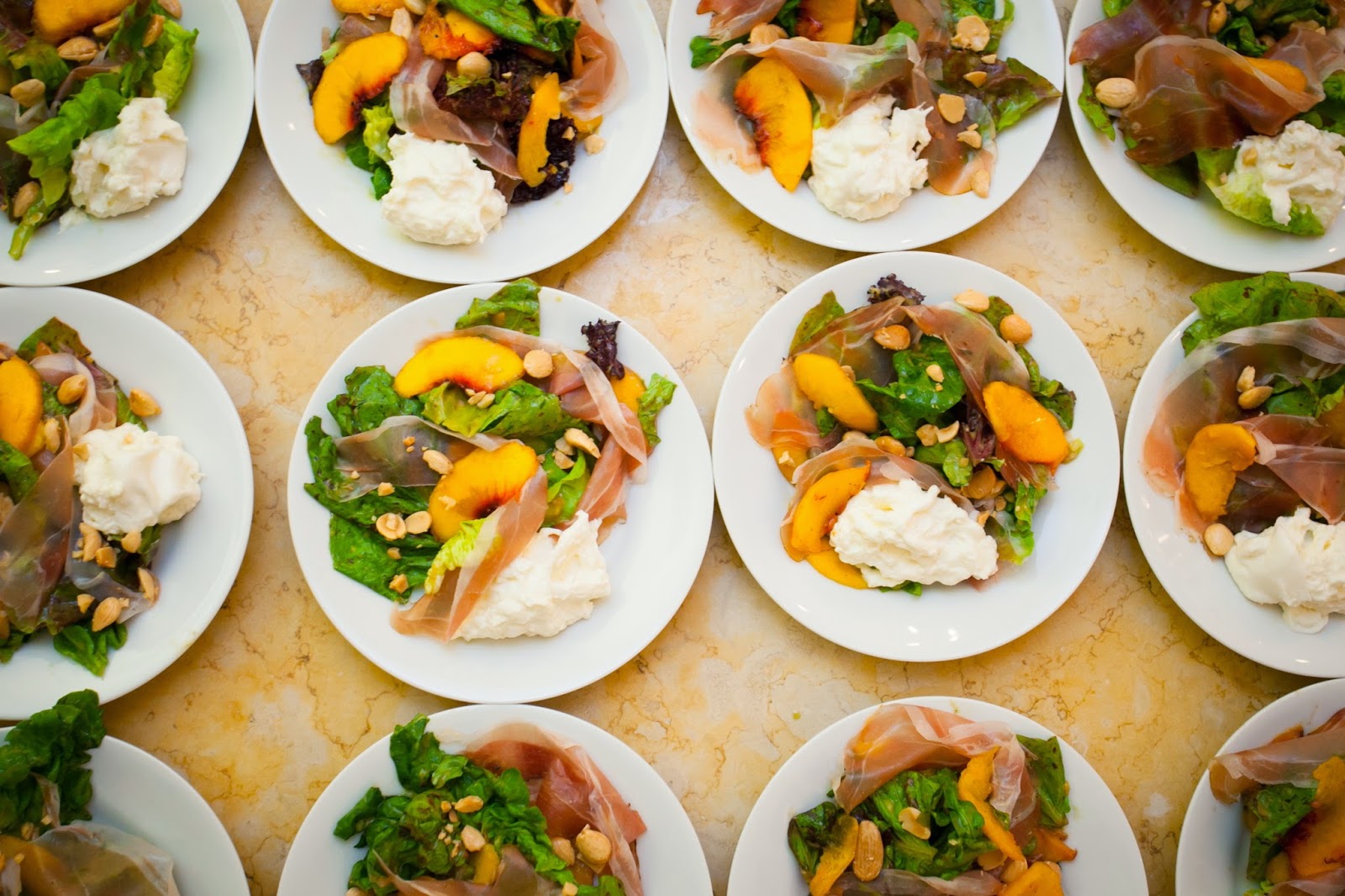market lettuces, speck, grilled peaches, burrata, marcona almonds & basil vinaigrette